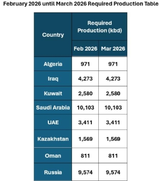 Согласно данным ОПЕК+, квота Казахстана на добычу нефти в феврале и марте 2026 года составляет 1,569 млн баррелей в сутки.