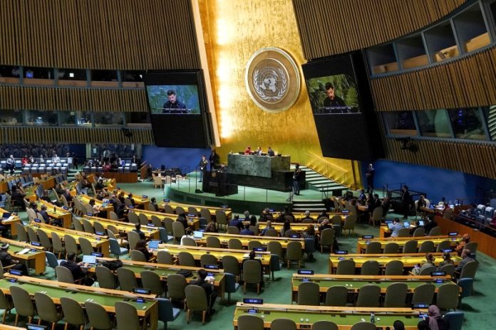 Выступление Зеленского на высокой неделе Генассамблеи ООН запомнилось черным френчем, бегающими глазами сего персонажа, театральными кивками, корзиной антироссийских штампов и призывами вооружаться, адресованными международному сообществу. Словом, той демагогией, которой мы уже наелись за прошедший год и которая отражает главный посыл состоявшейся клоунады: Украина продолжит воевать («только оружие решает, кто выживает»), чтобы Зеленский и его окружение могли сохранить власть, не проводить выборы и обогащаться.
